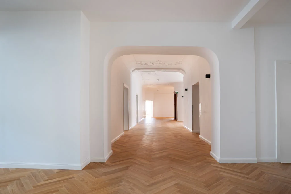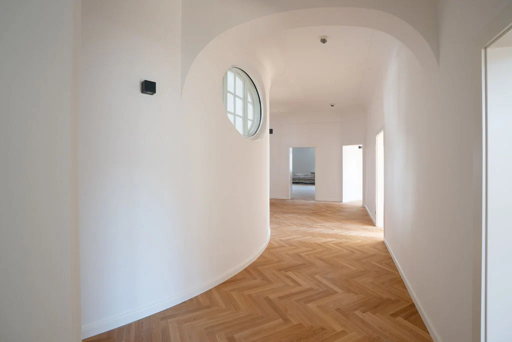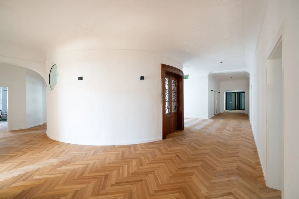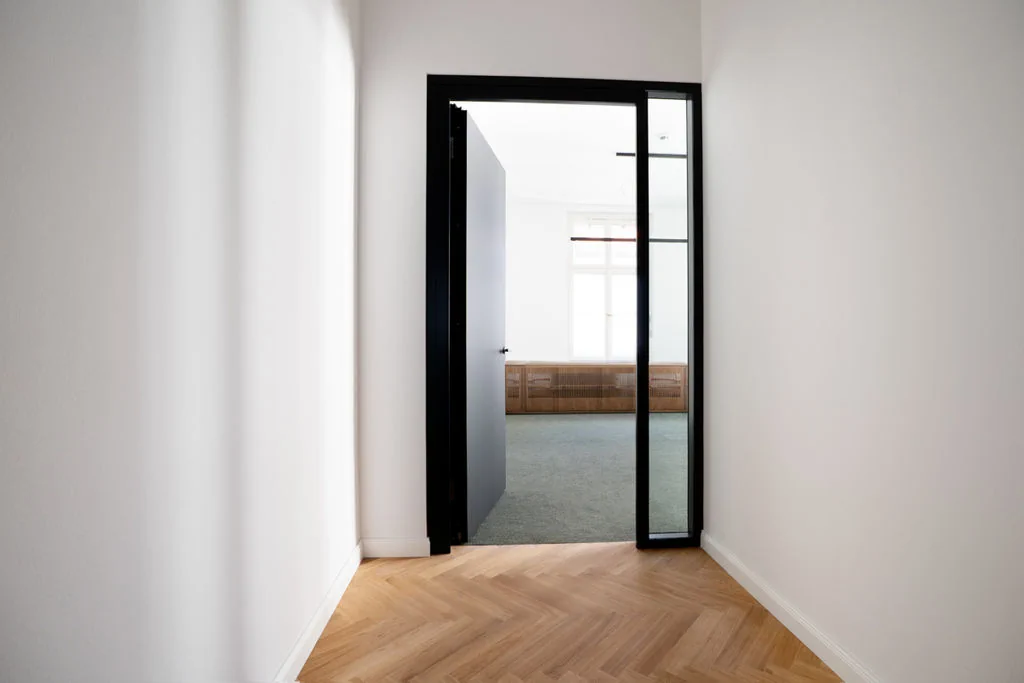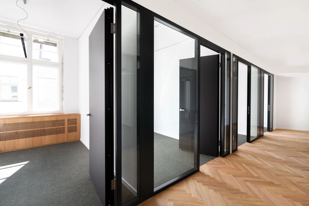 - Hochwertige Glastrennwände und ein edles Fischgrätparkett unterstreichen den anspruchsvollen Charakter dieses Projekts und spiegeln höchste Qualitäts- und Gestaltungsansprüche wider.